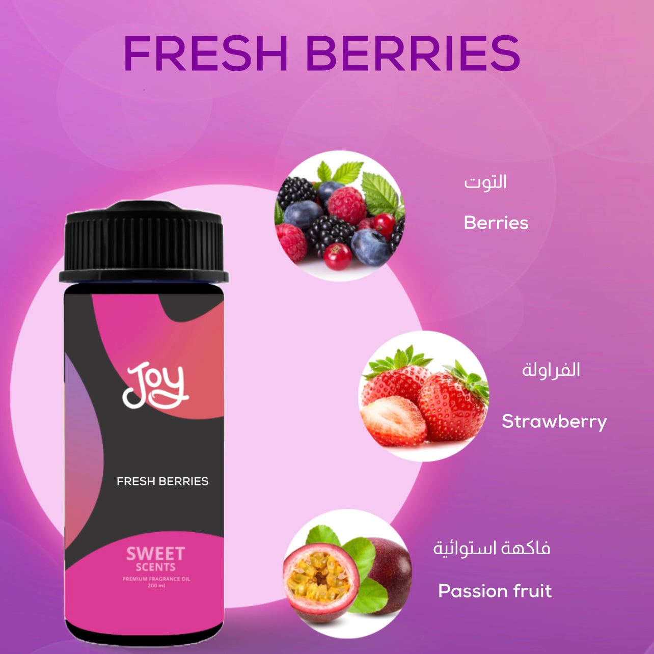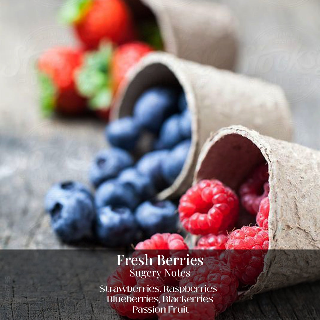 Fresh Berries is a sugary scent bursting with strawberries, raspberries, blueberries, blackberries, and passion fruits, exuding a lasting freshness reminiscent of a sun-kissed berry patch.